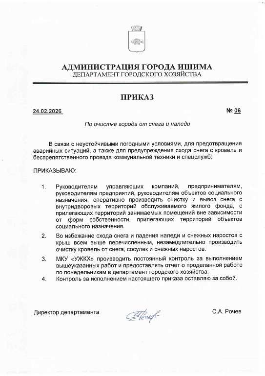 Во избежание несчастных случаев департаментом городского хозяйства подготовлен приказ о необходимости выполнения работ по очистке кровель от снега и наледи, управляющим компаниям даны разъяснения о мерах ответственности за неисполнение обязательств.